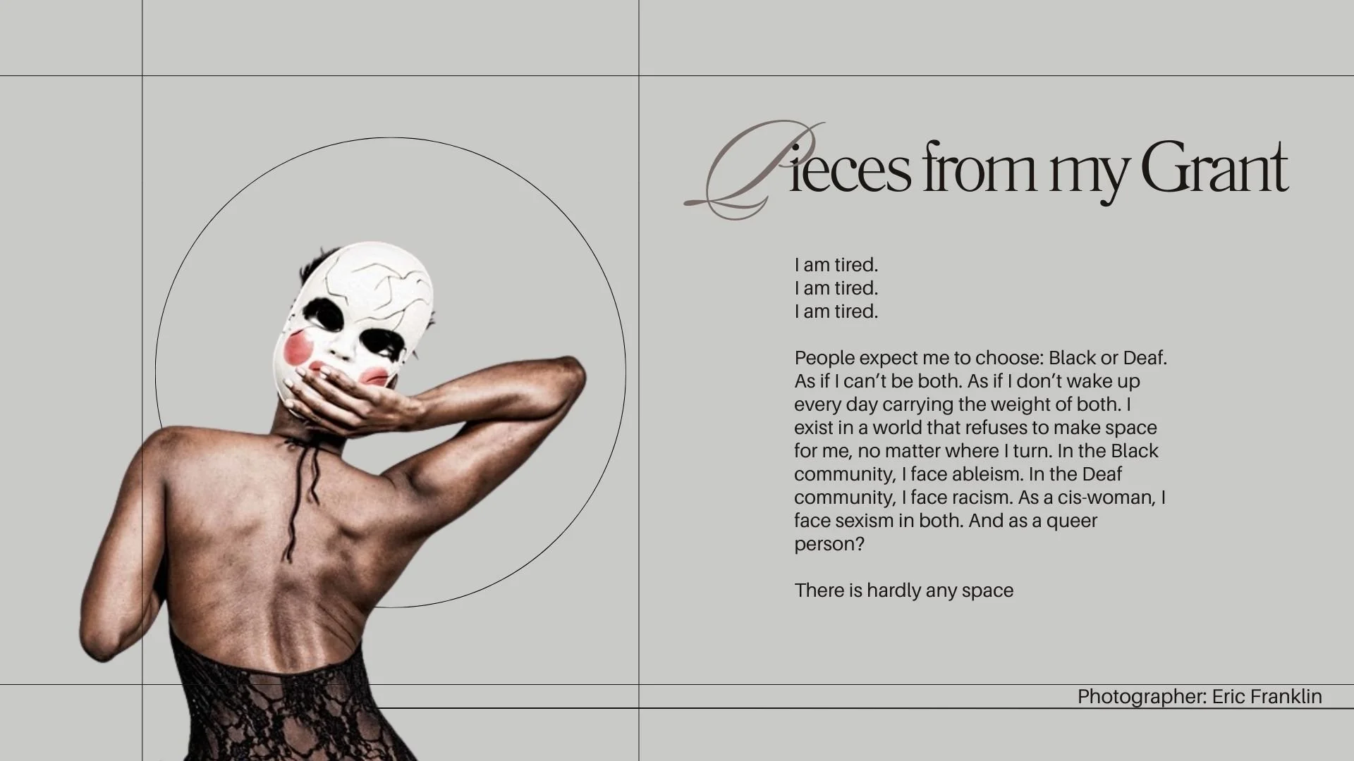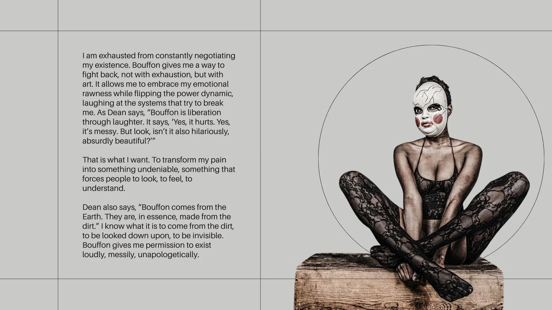 Roots in My Throat is a theatre research project exploring Bouffon clowning through the lived perspective of a Black Deaf woman. In mentorship with Dean Bareham of Green Fools Theatre, Ebony R. Gooden is investigating the grotesque humour, satire, and physicality of Bouffon to begin creating a new character rooted in her experiences of exclusion, speech therapy, and survival.. It critiques systems of oppression such as racism, ableism, and audism by exposing their absurdities, while exploring survival, identity, and liberation through satire, embodied performance, and Deaf-led storytelling.